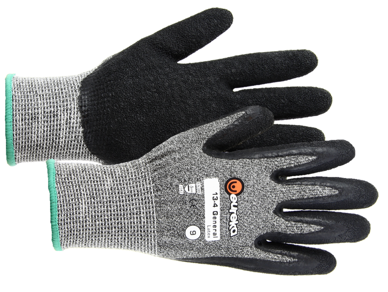 Eureka 13-4 Edge Latex Glove featuring Wrinkle latex coating for abrasion resistance. Made from fibreglass and suprablock cut fabric, this glove gives excellent cut protection Cat II.